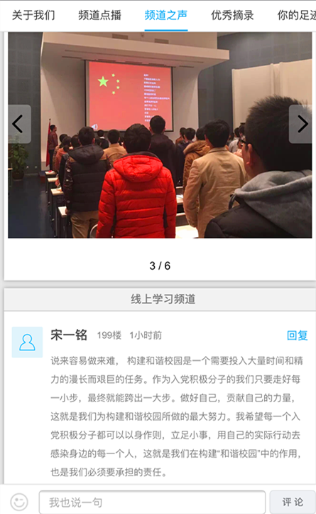 讨论以小组形式发布与全体讨论结合的形式相结合进行,每个小组负责一个话题的主持工作,此举不但达到了让大家各抒己见、交流探讨的效果,更使每位小组成员在此过程中以主人翁的姿态参与话题讨论,培养责任意识的同时也增强了归属感。在第一期的话题讨论“建党95周年以来中国共产党党史上重要的人物和事迹”一经发布,便立刻引发学生的热烈讨论。该话题旨在使全体同学通过对党史和优秀共产党员的回顾,获得一种榜样力量和精神支撑,也对自己未来的发展方向产生一个更加具象的认知。