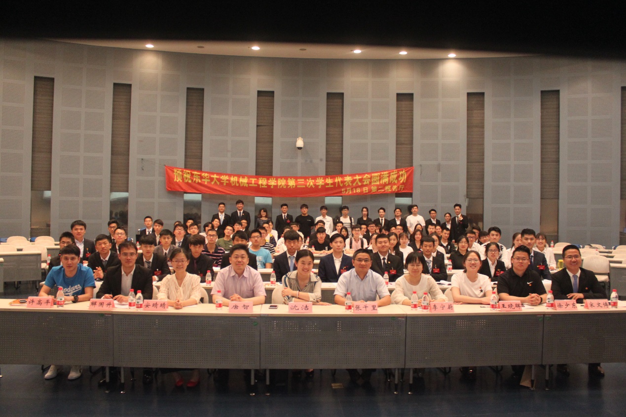 5月18日,机械学院第三次学生代表大会在松江校区图文信息中心第二报告厅举行。机械学院党委书记张千里、校团委书记沈洁、机械学院副院长唐智、机械学院党委副书记李宁蔚,兄弟学院团委书记代表、以及机械学院专兼职辅导员,机械学院全体学生代表、兄弟学院学生会代表与会。会议听取和审议机械学院学生会工作报告,机械学院研究生会工作报告,听取和审议学代会提案工作报告,选举产生机械学院第三届学生委员会委员和学生会新一届主席团。