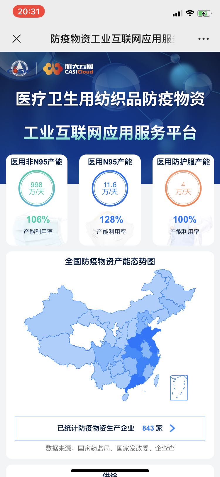 平台通过“透明、准确、直观、高效”的方式,解决防疫物资产能、供给方面的突出矛盾,为防疫物资产能供给保驾护航。平台为防疫物资生产企业提供快速对接服务,从提升产能入手,解决防疫物资需求侧的缺口。平台为用户提供可靠的资产能数据,实现全国产能信息一图了然,防疫物资生产有据可依,医疗物资缺口高效匹配,专家线上指导支招生产,海外企业入驻全球支援,从而有效解决防疫物资生产过程中“缺材料、缺设备、缺专家、产能低”的问题。平台刚刚发布就成功帮助一家湖南转产口罩生产的企业对接成功紧缺资源熔喷布,上线第一天就有8家企业已采购到相应物资。截止目前,平台已经更新到第二版,累计浏览次数2万次;发布需求62条,供给信息532条,已经有843家物资生产企业信息展示在平台上。