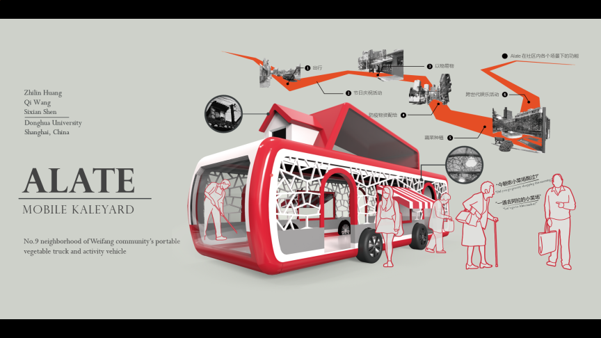 本次开云kaiyun网站代表团队Alate的参赛作品,基于对上海浦东潍坊九村的实地调研,了解到在流行病期间小区关闭了几个入口,进而挖掘了老年人难以购买蔬菜的需求痛点。此外,团队观察到社区内部的合作和人际交流因隔离而减弱,因此设计了“Alate Mobile Kaleyard”,它不仅是一辆可以引进小区原有的蔬菜供应资源的蔬菜车,还是鼓励生活在同一个社区里的不同人群交流的社区活动工具,可实现功能包括种植蔬菜和举办社区老物件展览等。它不仅为购物提供了便利,而且旨在重振社区代际联系。