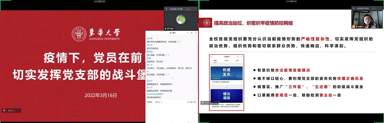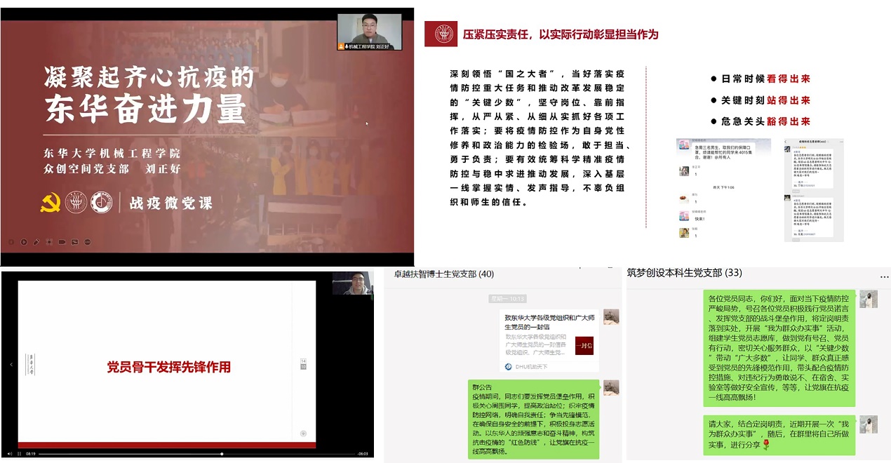 各党支部纷纷第一时间响应学院党委号召,围绕主题动员大课组织开展“让党旗在防疫一线高高飘扬”系列战“疫”党课,从《凝聚起齐心抗疫的东华力量》到《遵法抗疫,共克时艰》等不同角度,引导党员深刻体认“国之大者”,将疫情防控作为当前最重要的任务,做到日常时候看得出来、关键时刻站得出来、危急关头豁得出来,坚持党有号召、党员有行动,将疫情防控作为锻炼党性修养和政治能力的检验场,敢于担当、勇于负责,自主自觉做到不聚集、少流动、不添麻烦,积极落实、推广“一米线”“三件套”“五还要”等防疫措施。同时,围绕定岗明责要求,深化开展一次主题鲜明的“我为群众办实事”实践,及时联系好、关心好、服务好广大的师生群众,深入身边群体,了解他们的需求、回应他们的关切,贯彻体现共产党员的本色与义务。