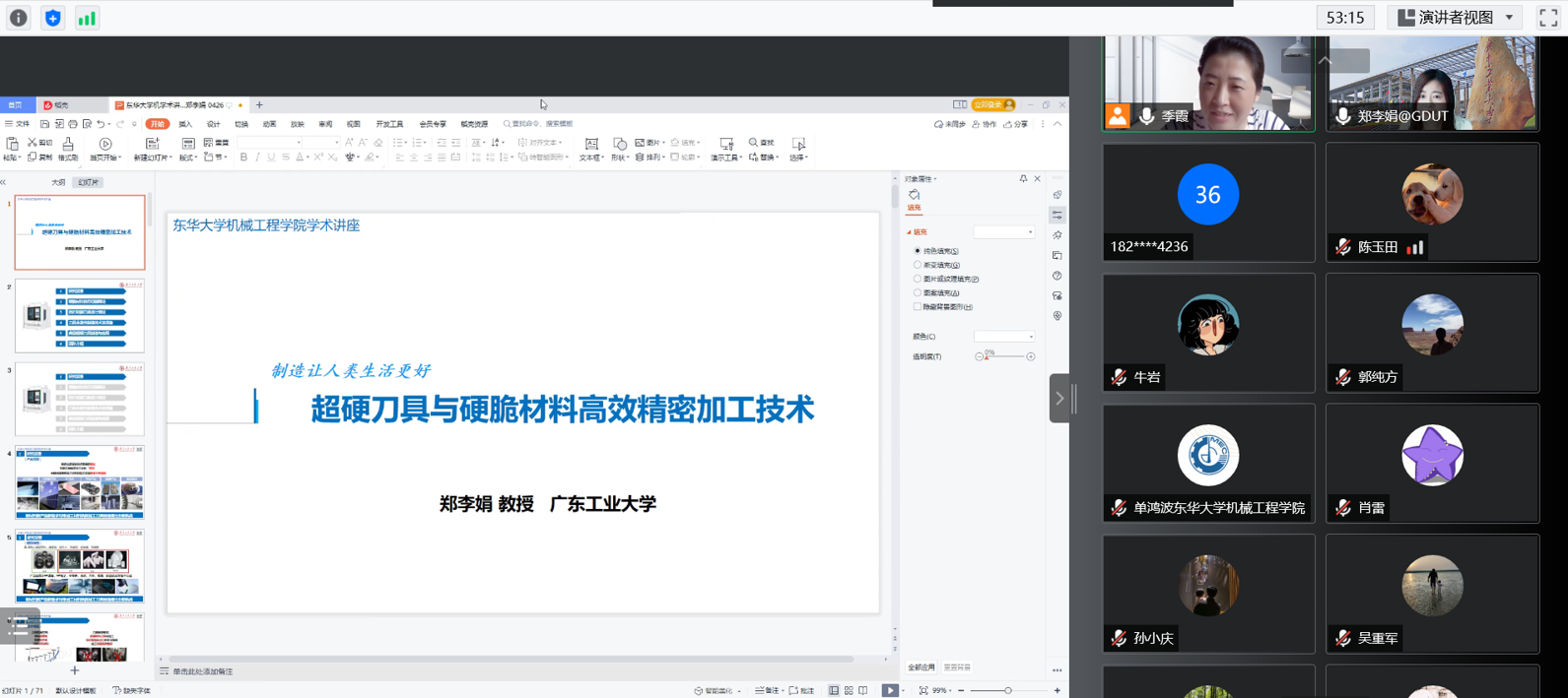 4月26日,国家优秀青年科学基金获得者郑李娟教授受邀为开云官网做题为《超硬刀具与硬脆材料高效精密加工技术》的学术报告。院长单鸿波、部分中青年教师、行业技术专家、博硕士研究生等线上参加了本次报告会。报告会由院务委员季霞老师主持。