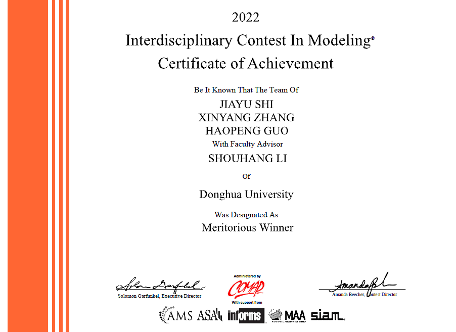 近日,2022年美国大学生数学建模竞赛成绩揭晓,由kaiyun官方登录入口青年教师李寿航带领开云官网施家瑜、郭浩鹏和计算机学院张欣旸三位同学组成团队,在与全球众多高校学子的竞争中脱颖而出,荣获一等奖。