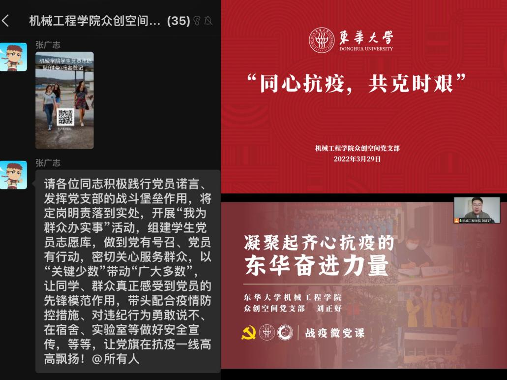“在这里,每一位东华人守望相助,充满温情,是你们让我相信,东华人永远团结,东华人永远站在一起!”支部党员刘正好第一时间响应学院党委号召,结合自身经历主讲“让党旗在防疫一线高高飘扬”系列战“疫”党课,从《凝聚起齐心抗疫的东华力量》的角度引导支部党员深刻体认“国之大者”;3月29日,支部召开“同心抗疫,共克时艰”主题线上党日活动,进一步引导支部党员在疫情防控工作中厚植爱国主义情怀、强化责任担当意识、彰显拼搏奋斗精神、坚定必胜信心。