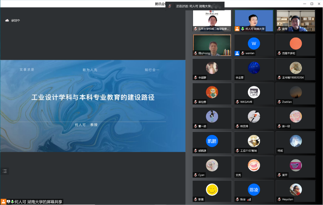 本次讲座,何人可教授以“工业设计学科与本科专业的建设路径”为主题,以湖南大学设计教育和设计研究的跨越式发展为出发点,聚焦设计理论与战略、智能设计方法与工具、文化科技融合与社会创新三大模块,围绕工业设计学科专业的智能装备、智能出行、数据智能与服务设计、智慧健康、可持续与生态设计、数字文化创新六大模块,结合湖南大学工业设计人才培养、学科方向、队伍建设、基地平台等方面,通过具体的产学研合作案例,全面系统介绍了新文科、新工科、新设计背景下培养“新时代经世致用的设计领军人才”的时代之需和价值引领。