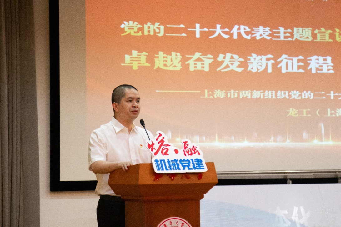 一场“党建引领”主题宣讲,一项“服务发展”启动仪式,一次“联学联建”圆桌交流。5月16日,“党建引领聚合力,服务发展建新功”机械学院推进“一融双高”联学联建活动在松江校区举行,活动邀请到党的二十大代表、上海市两新组织党的二十大精神“百师百讲”巡讲专家宣讲团成员、龙工(上海)机械制造有限公司调度室主任邹丰恒作主题宣讲。松江区发展和改革委员会主任孙文杰,松江区党建服务中心主任金晓燕,松江经济技术开发区党工委委员杨茜,两新组织企业代表库卡柔性系统(上海)有限公司党支部书记张引,企福天地党支部委员宋丹丹,开云官网校党委常委、党委宣传部部长任晓杰、党委组织部副部长李宁蔚、机械学院党委书记王新厚等参加活动。