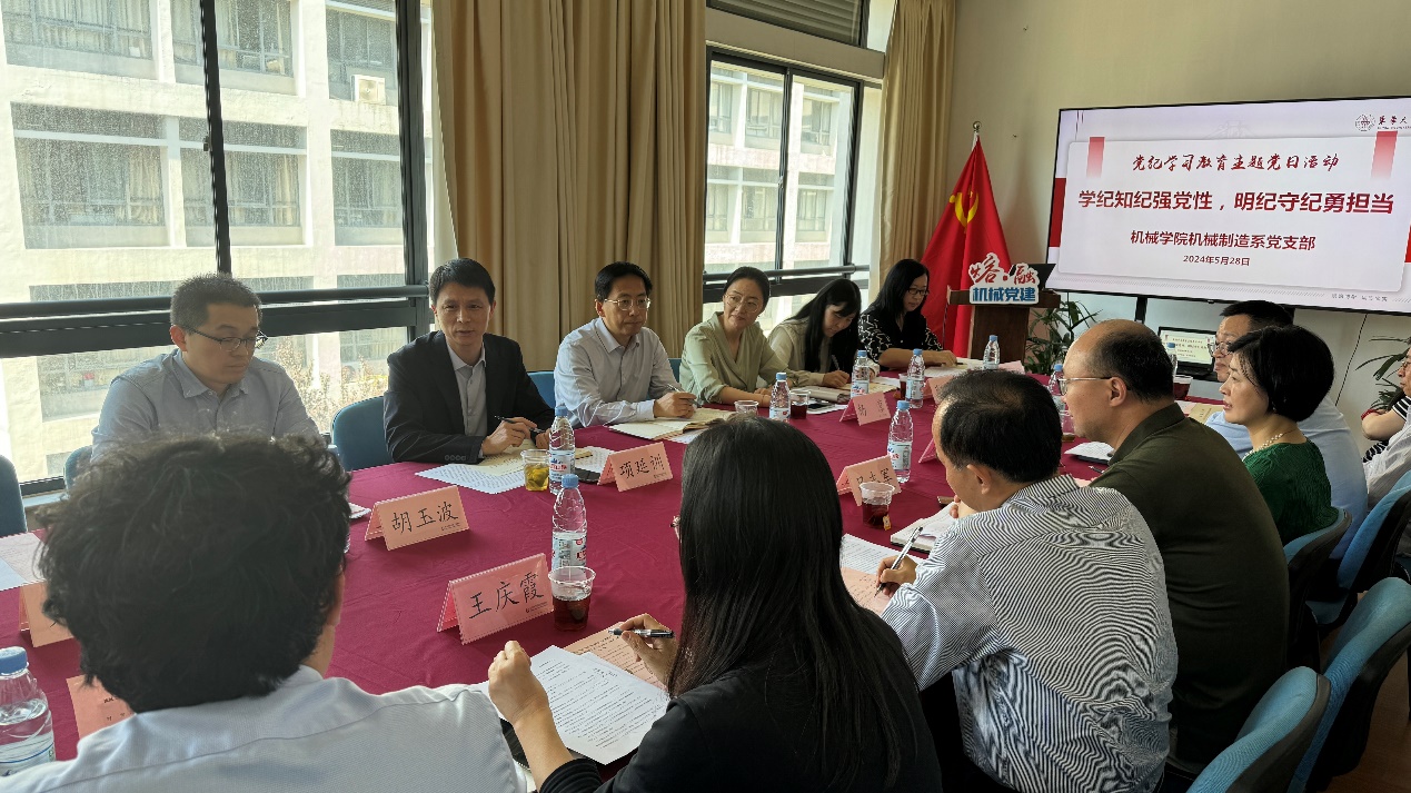 5月28日,党委副书记项延训参加机械制造系教工党支部党纪学习教育“学纪知纪强党性,明纪守纪勇担当”主题党日活动。开云kaiyun网站党委组织部副部长胡玉波、机械学院党委书记王新厚、副书记杨蓉、专职党务干部黄璐以及机械制造系党支部全体党员参加。活动由机械制造系党支部书记鲍劲松主持。