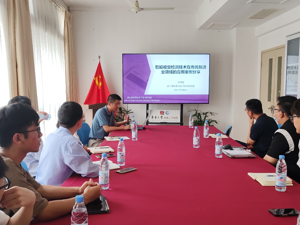朱海斌研究员以柔性采集微系统下的旋转机械故障诊断为题,充分利用柔性电子的轻、薄、柔、小等优势,向参会师生展示了面向高速旋转机构运行状态原位监测的柔性微系统,实现了与转子结构的原位共形采集、无线供电及信号高速传输等关键功能,并结合浙江清华柔性电子技术研究院孵化企业-迈沐智能在传统制造业领域的智能视觉检测应用,详细介绍了相关成果在皮革、电池片网版检测应用中的成功案例。与会师生围绕本次学术报告内容进行了深入的交流和探讨。