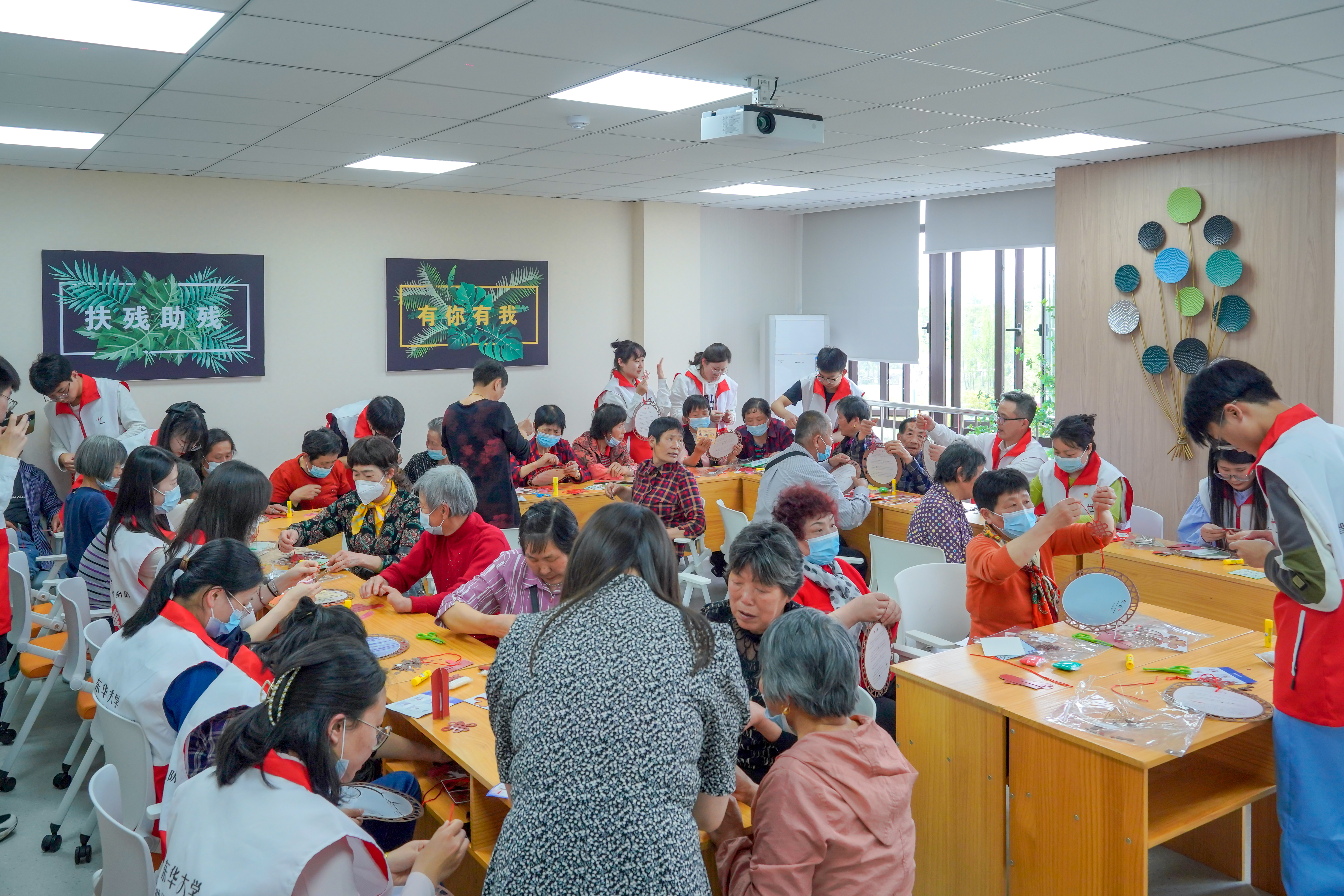 (智力助残志愿者与残障老人共同编织二十四节气团扇)