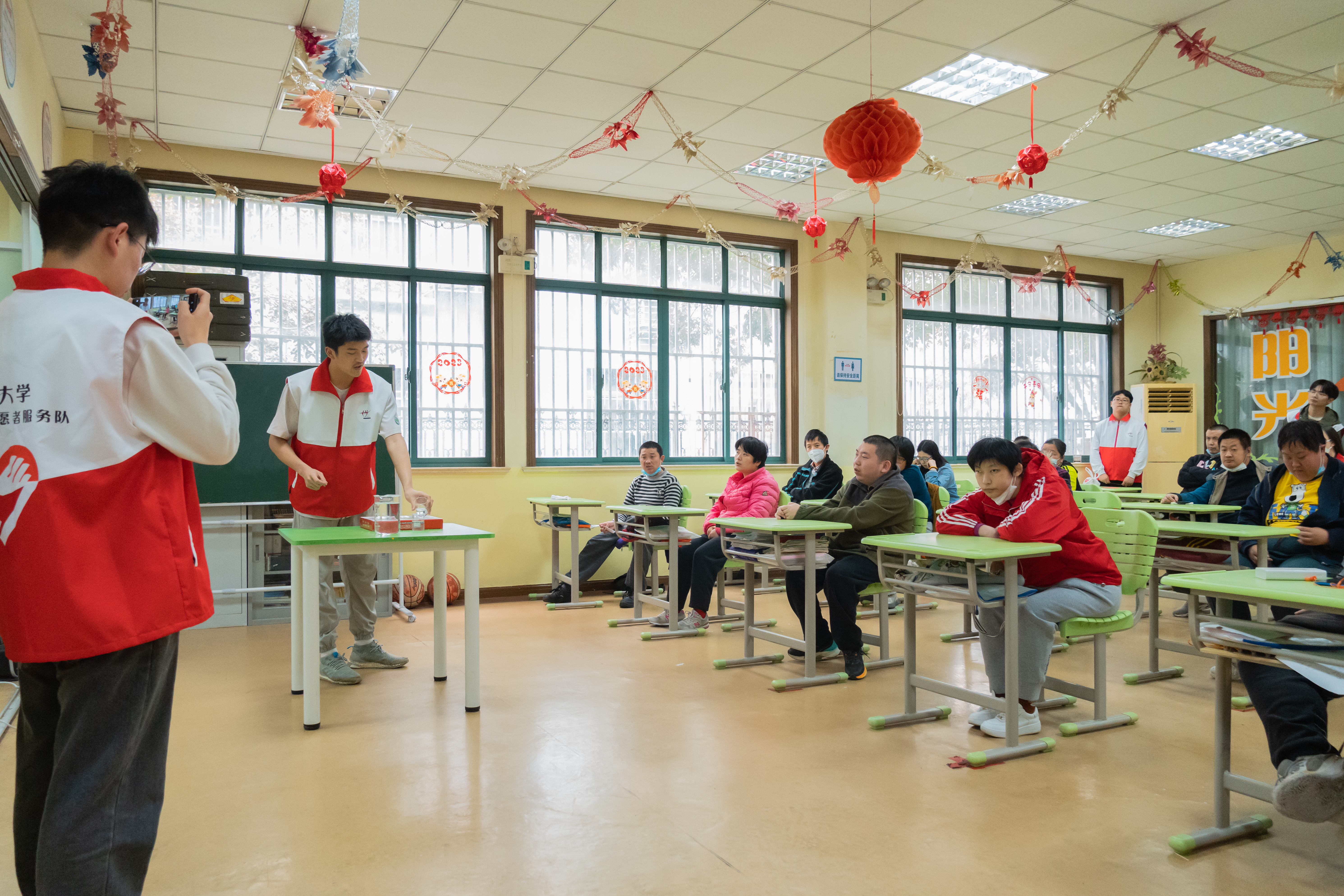 智力助残志愿者服务队由机制9460余名同学正式发起,成立于1995年,是上海市最早成立的高校助残志愿服务队伍之一。定期组织志愿者前往阳光之家开展为智障人士献爱心活动;发挥机械制造、工业设计等专业特长,为残疾人和老人研发辅助器具、康复器械开展科普类实验课程、益智类绘画课程,与残疾人合作开发文创产品帮助残障人士更好地融入集体与社会;点对点为残疾人子女提供义务家教,帮助他们做好未来规划……服务队作为上海市“智力助残”志愿者基地六大分基地之一,共培养1.25万余名志愿者,累计服务时长39.8万小时,足迹遍布上海市社区街道、残疾人家庭等惠及10.7